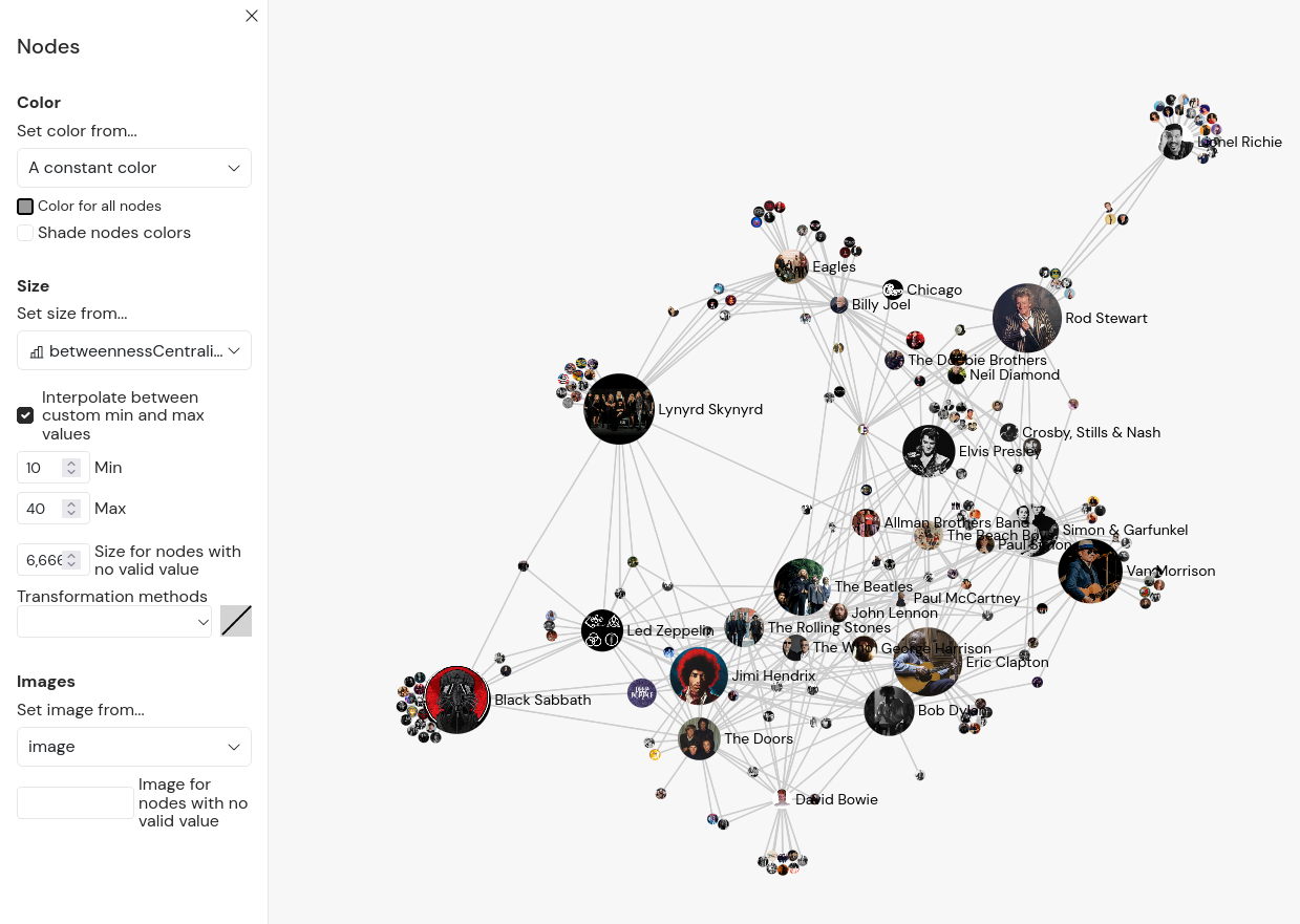 There is a way out of this system, though: It is possible to directly use a data column for a given visual variable. That is exactly what happens by default when a GEXF from Gephi is loaded, for instance: